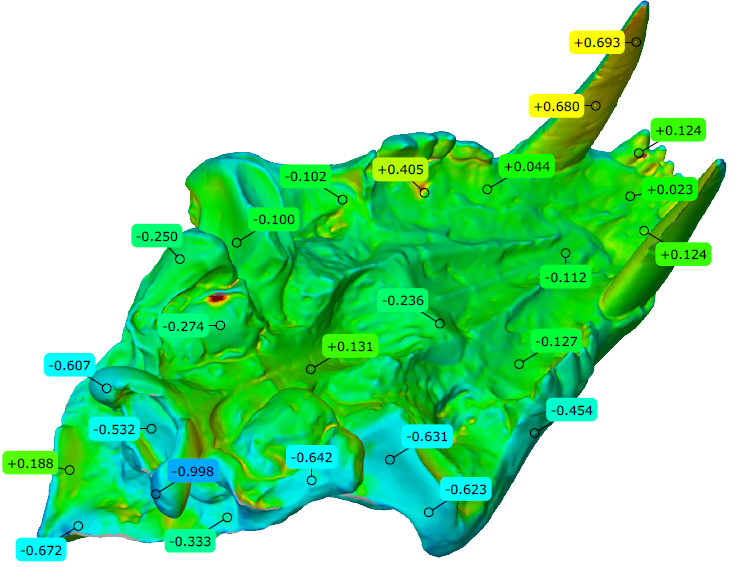 打印后我們對模型進(jìn)行了再次掃描,全尺寸檢測的結(jié)果顯示,激光燒結(jié)技術(shù)打印這類復(fù)雜曲面化石模型的精度是比較高的,可以滿足化石修復(fù)工作的任務(wù)要求,并且相對其他3D打印技術(shù)來說,模型的強(qiáng)度和耐久性更有優(yōu)勢,SLS在數(shù)字化考古修復(fù)領(lǐng)域有很好的應(yīng)用價(jià)值。