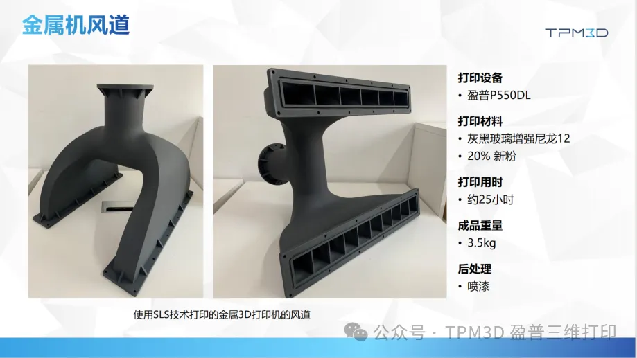 而盈普 SLS 大尺寸設(shè)備成功攻克這一難題。某金屬機(jī)生產(chǎn)商借助盈普 P550DL 大尺寸雙激光設(shè)備,順利實(shí)現(xiàn)重達(dá) 3.5kg、內(nèi)部結(jié)構(gòu)復(fù)雜的風(fēng)道一體化成型打印。在雙激光器的高效運(yùn)作下,整個打印過程僅耗時約 25 小時,極大簡化生產(chǎn)工序,顯著提升生產(chǎn)效率。