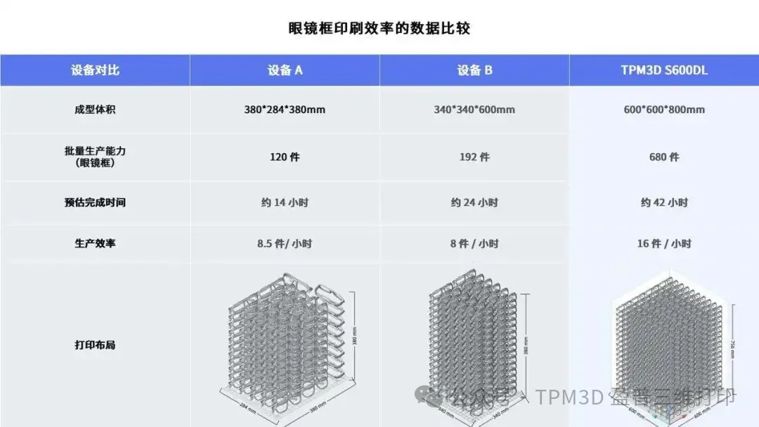 TPM3D 批量生產(chǎn),產(chǎn)量倍增 盈普大尺寸設(shè)備不僅擅長打印大尺寸零件,在中小零件批量生產(chǎn)方面同樣表現(xiàn)出色,通過優(yōu)化單次打印零件排布,大幅提高打印效率。據(jù)國外專業(yè)行業(yè)媒體3D Natives報道,S600DL一次可打印約680個眼鏡框(打印高度 800 毫米),平均每小時可打印16件,較其他尺寸打印機(jī)每小時8 到 8.5 件的效率實(shí)現(xiàn)翻倍。