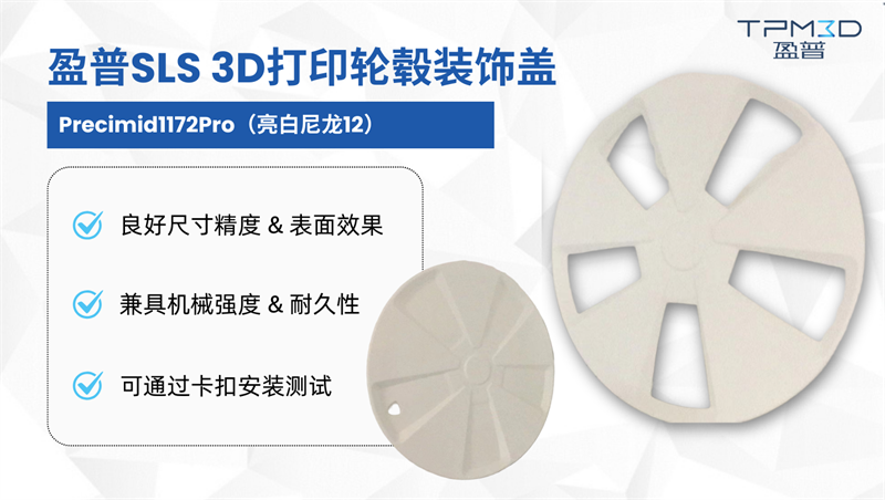 采用 Precimid1172Pro 亮白 PA12 材料打印的輪轂裝飾蓋,具備良好的尺寸精度和表面效果,兼具機(jī)械強(qiáng)度和耐久性,可通過卡扣安裝測試。同時,零件支持噴漆、電鍍等后處理工藝,能 1:1 模擬最終量產(chǎn)件的外觀效果,助力設(shè)計方案更快落地驗證。