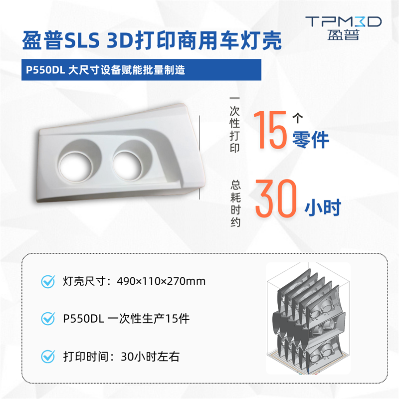 針對商用車燈殼的原型制造需求,盈普三維 P550DL 設(shè)備(成型缸尺寸 550×550×850mm)展現(xiàn)出強(qiáng)大的批量生產(chǎn)能力,一次性打印 15 件燈殼,僅需約 30 小時,相比傳統(tǒng)流程加工效率顯著提升。且采用的 Precimid1172Pro 白色尼龍 12 材料綜合性能優(yōu)秀,滿足原型件的機(jī)械性能測試需求。