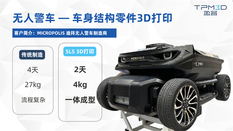 迪拜無人警車制造商 MICROPOLIS 采購盈普 S600DL 設(shè)備,使用 Precimid1172Pro GF30 BLK 玻纖增強(qiáng)材料,設(shè)計制造無人警車(包括車身結(jié)構(gòu)零件等),其中代表性零件為大尺寸車頭零件,有效解決傳統(tǒng)工藝痛點。